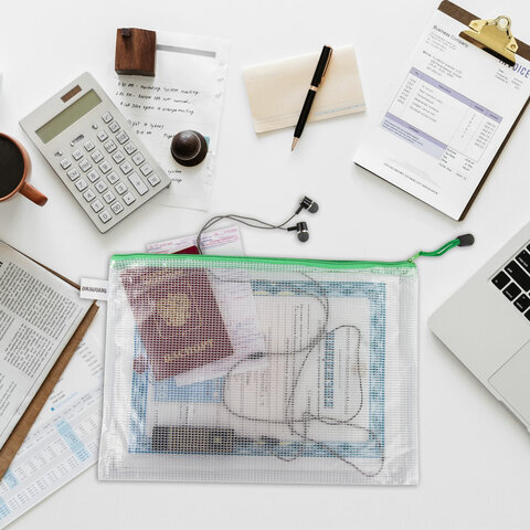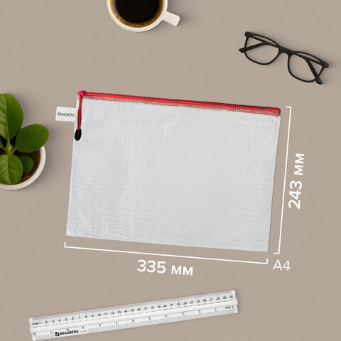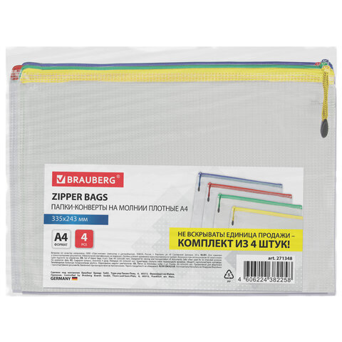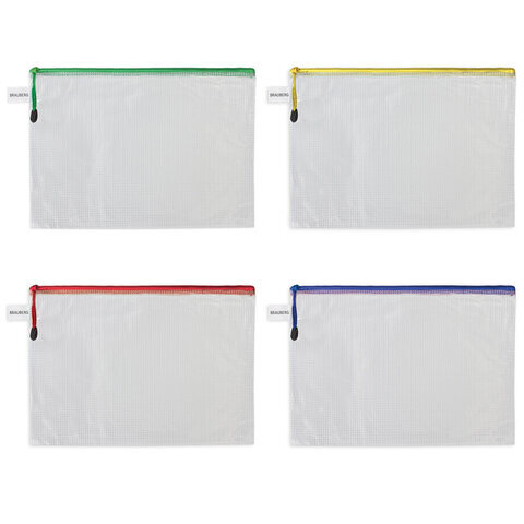 Папка-конверт СУПЕР КОМПЛЕКТ на молнии ПЛОТНЫЕ 4 штуки А4, сетчатая, BRAUBERG, 271348