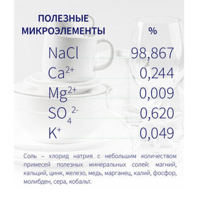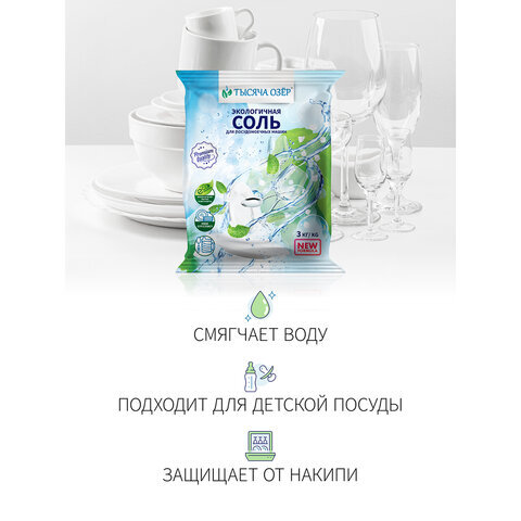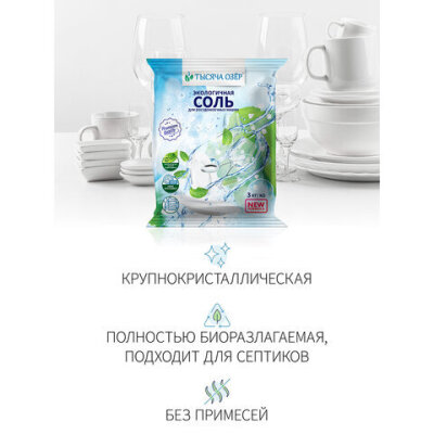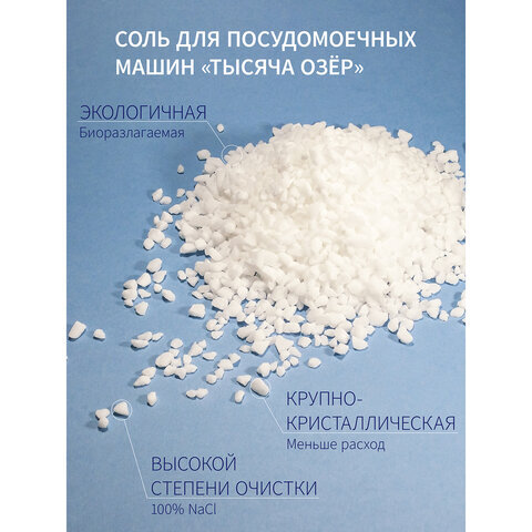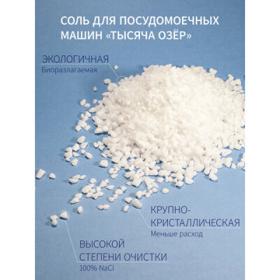 Крупнокристаллическая гранулированная особо чистая соль для посудомоечных машин ТЫСЯЧА ОЗЁР предназначена для эффективной работы блока смягчения воды в посудомоечной машине. Подходит для всех типов посудомоечных машин.
