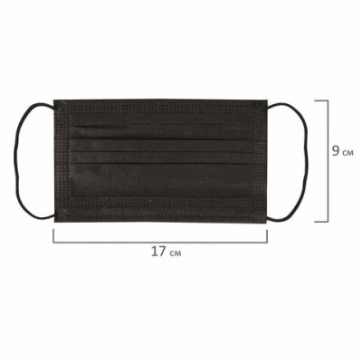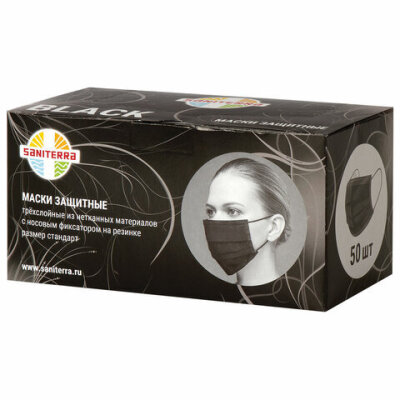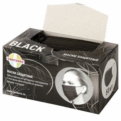 Маски одноразовые КОМПЛЕКТ 50 штук, короб, 3-х слойные, черные, SANITERRA