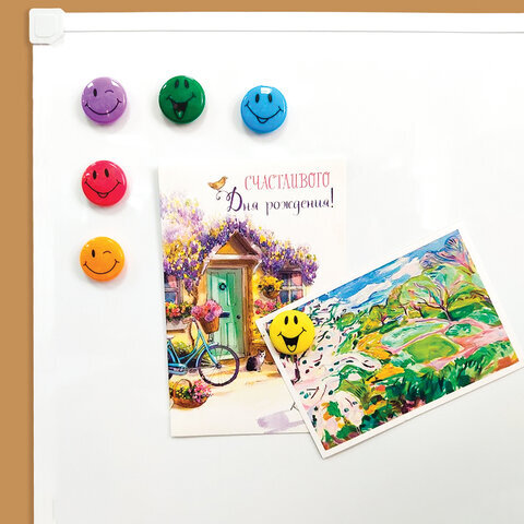 Оригинальные магниты ЮНЛАНДИЯ "СМАЙЛИК" с улыбкой помогут надежно прикрепить листы бумаги к магнитно-маркерной поверхности досок, витрин, флипчартов и холодильников.