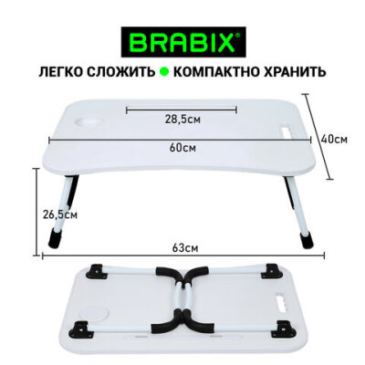Столик для ноутбука BRABIX отлично подойдет для работы с ноутбуком лежа, для занятия творчеством, для завтрака в постели. Столик можно использовать в качестве полки. Также он станет полезным подарком для друзей, родственников и коллег.