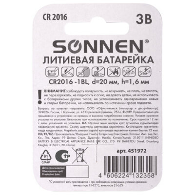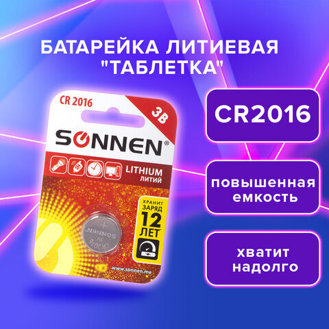 Батарейка литиевая SONNEN Lithium CR2016 "таблетка, дисковая, кнопочная" 1 шт., блистер, 451972