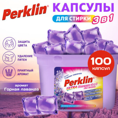 Капсулы для стирки белья PERKLIN (ПЕРКЛИН) "ГОРНАЯ ЛАВАНДА" концентрат 3 в 1 с кондиционером 100 шт., 700127
