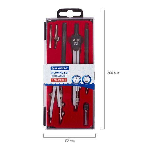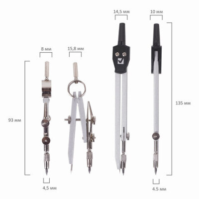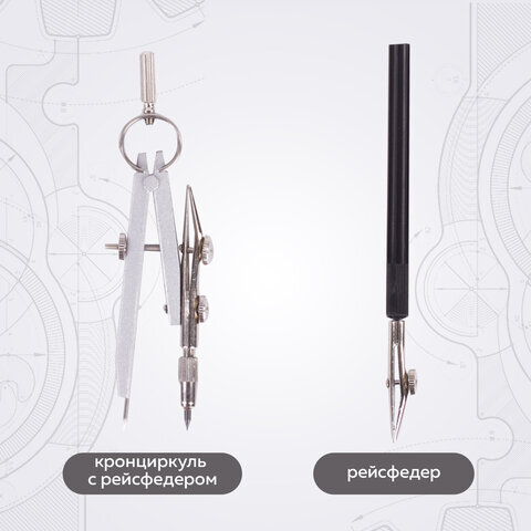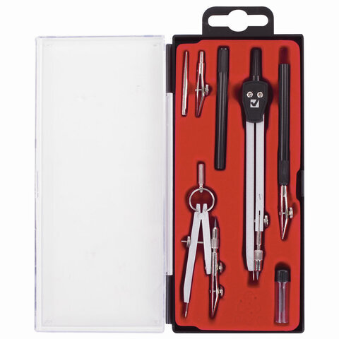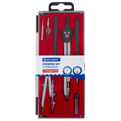 | Комплектация | игольная вставка, кронциркуль, пенал с запасным грифелем, рейсфедер, рейсфедерная вставка и держатель, циркуль |
