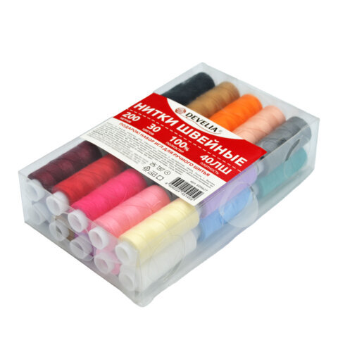 Нитки швейные 40 ЛШ, 200 м, полиэстер, НАБОР 30 цветов, в ПОДАРОК набор игл, DEVELIA (Девелиа), 609627