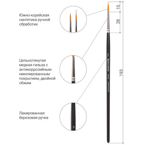 Художественная профессиональная синтетическая кисть BRAUBERG ART "CLASSIC" № 3 предназначена для работ густыми красками: гуашь, акрил, масло, темпера. Идеальна для водорастворимых масляных красок.
