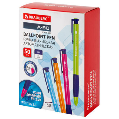 Ручка шариковая автоматическая BRAUBERG A-30 COLOR MIX "WRITING 3.0", СИНЯЯ, пишущий узел 0,5 мм, линия письма 0,25 мм, 144341
