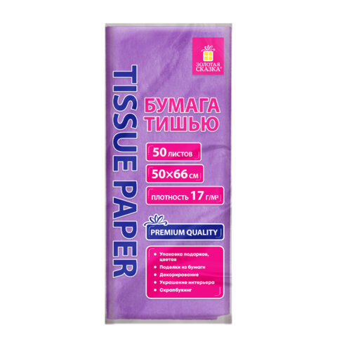 Цветная бумага ТИШЬЮ 17 г/м2, 50х66 см, 50 листов, сиреневый цвет, ЗОЛОТАЯ СКАЗКА, 116488
