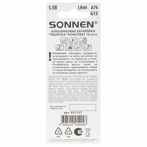 Батарейки алкалиновые "таблетка" КОМПЛЕКТ 10 шт., SONNEN Alkaline 76A (G13, LR44), в блистере, 457137