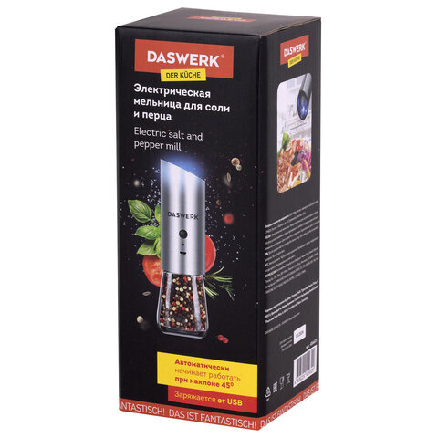Гравитационная USB электрическая мельница DASWERK подходит для специй, морской соли, перца и различных трав. Это устройство станет вашим незаменимым помощником на кухне.