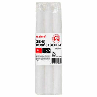 Свечи хозяйственные Standard, до 5 часов, КОМПЛЕКТ 6 шт., H=165 мм, D=16 мм, в пленке, LAIMA, 609205