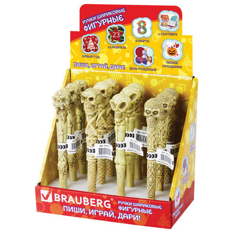 Ручка фигурная "ЧЕРЕПА-2", СИНЯЯ, 4 дизайна ассорти, линия письма 0,5 мм, дисплей, BRAUBERG, 142774