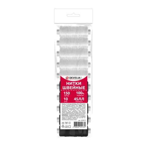Нитки швейные 45 ЛЛ, 150 м, полиэстер, НАБОР 10 штук, 5 белых / 5 черных, DEVELIA (Девелиа), 609619
