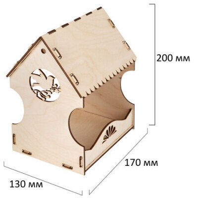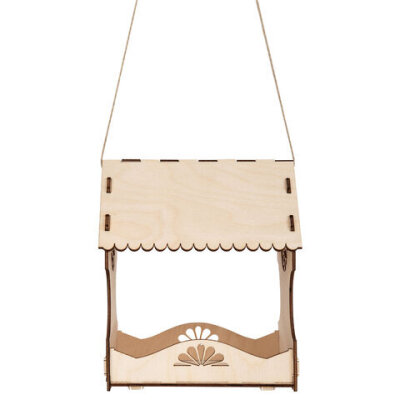 Кормушка для птиц "Рябинка" поставляется в разобранном виде, возможна сборка без клея и молотка. Все детали выполнены из качественной, шлифованной фанеры. Готовое изделие можно раскрасить акриловыми и гуашевыми красками или покрыть лаком.