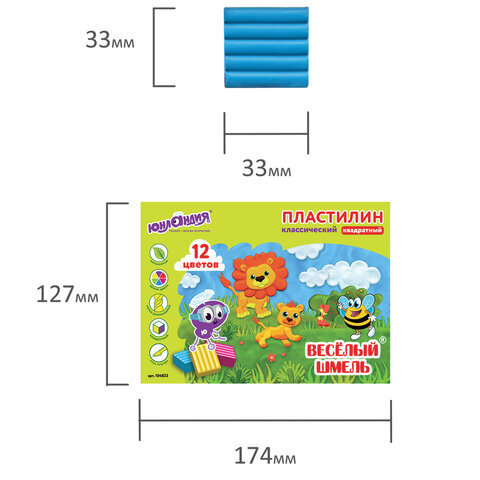 Пластилин классический ЮНЛАНДИЯ "ВЕСЁЛЫЙ ШМЕЛЬ", 12 цветов, 204 г, СО СТЕКОМ, КВАДРАТНЫЙ, 104823