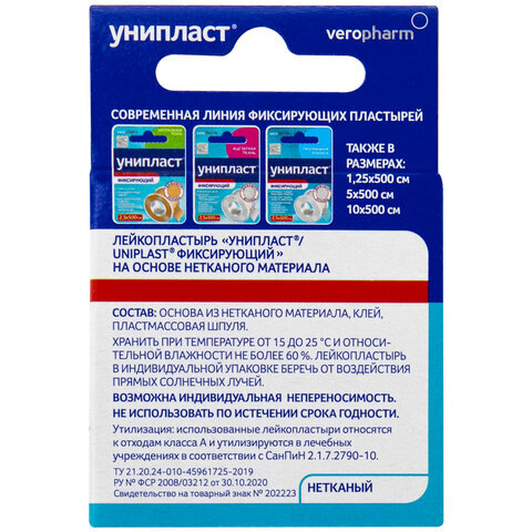 Лейкопластырь рулонный УНИПЛАСТ, 2,5х500 см, нетканая основа, катушка в картонной коробке, 20024382