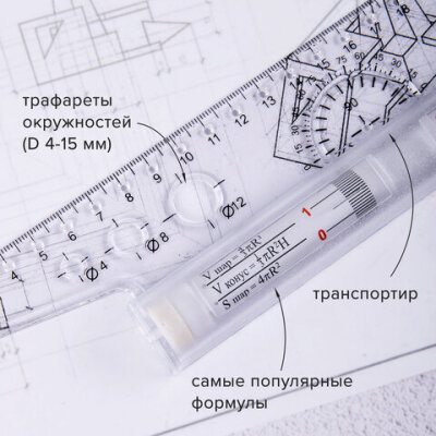 • Профессиональный чертежный инструмент в виде линейки с металлическим роликом. Включает в себя транспортир, и отверстия. Позволяет проводить параллельные линии на определенном расстоянии друг от друга. На ролике нанесены часто используемые формулы.