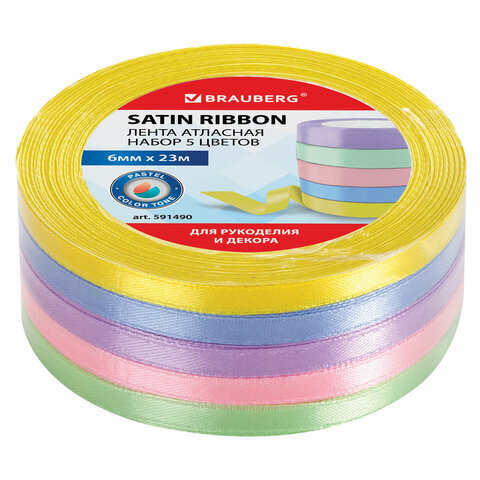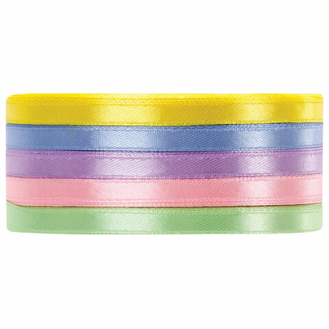 Лента атласная ширина 6 мм, ПАСТЕЛЬ набор 5 цветов по 23 м, BRAUBERG, 591490