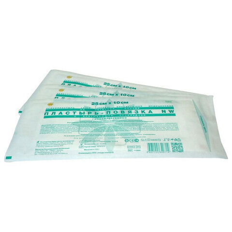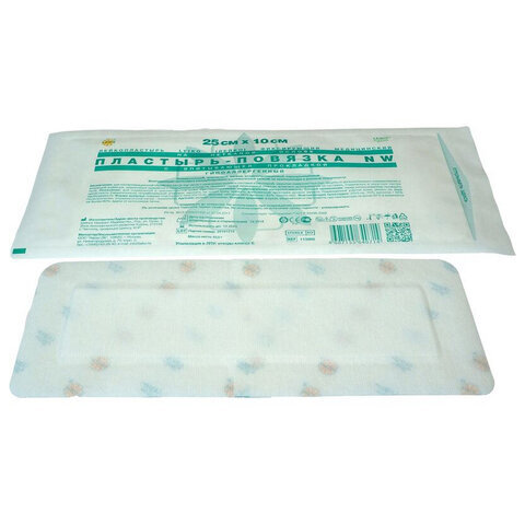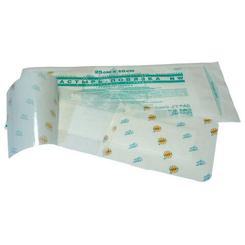 Стерильная пластырь-повязка на нетканой основе размером 10х25 см со впитывающей прокладкой и атравматичной сеткой. Универсальная, эластичная, мягкая, воздухо- и паропроницаемая.