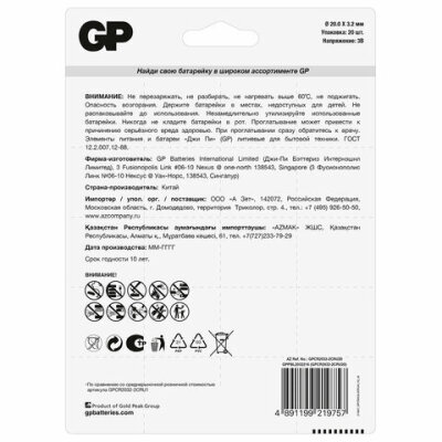 Батарейки литиевые GP Lithium CR2032 "таблетки, дисковые, кнопочные" КОМПЛЕКТ 20 шт., блистер, CR2032-2CRU20