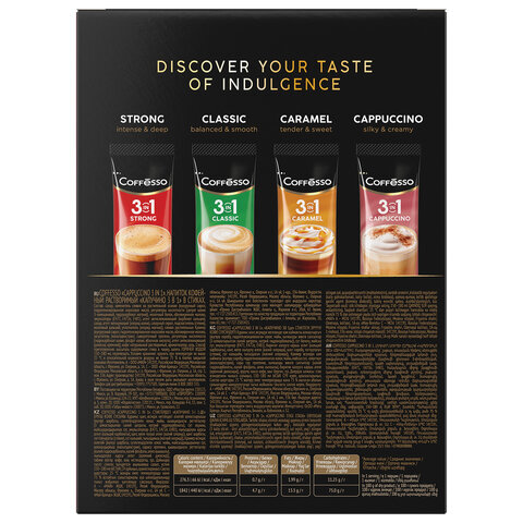 COFFESSO "3 в 1 Cappuccino" – это сливочный и шелковистый капучино с пышной пенкой и сладким послевкусием. Он позволит начать свой день с предвкушения приятных событий.
