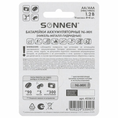 Батарейки аккумуляторные Ni-Mh пальчиковые / мизинчиковые НАБОР 8 шт. (AA+ААА) 2700/1000 mAh, SONNEN, 455612
