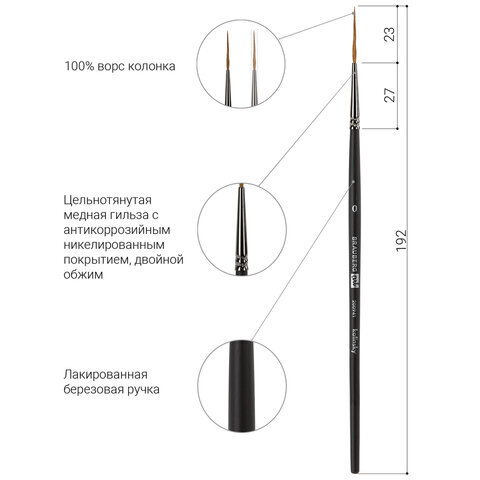 Кисть художественная проф. BRAUBERG ART CLASSIC, колонок, лайнер, № 0, короткая ручка, 200941