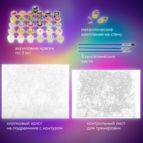 | Комплектация | акриловые краски, кисть, крепеж, лист бумаги для тренировки, холст на подрамнике |
