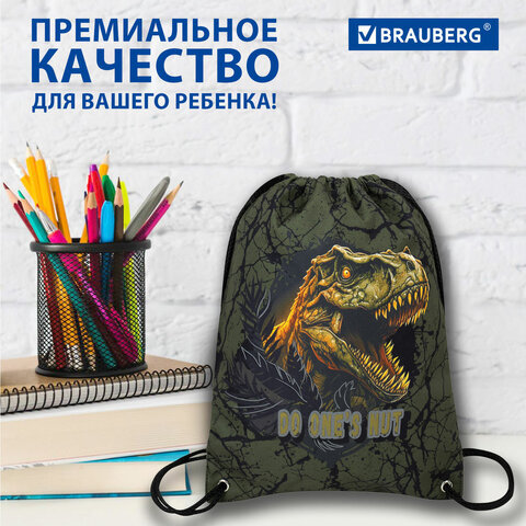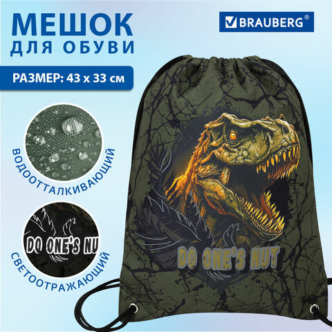Мешок для обуви BRAUBERG PREMIUM, карман, подкладка, светоотражайка, 43х33 см, Dino attack, 272424