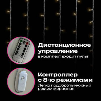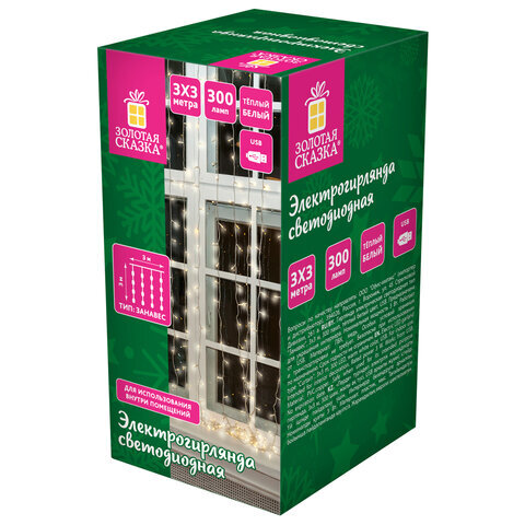 Электрогирлянда-занавес комнатная "Штора" 3х3 м, 300 LED, тёплый белый, USB, ЗОЛОТАЯ СКАЗКА, 592556
