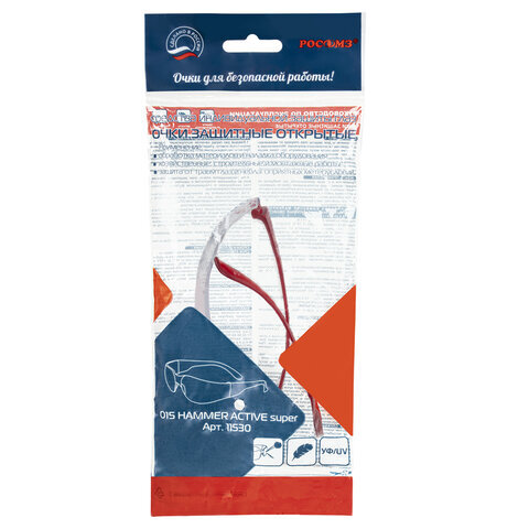 Очки защитные открытые РОСОМЗ О15 Hammer Active super, прозрачные, устойчивы к химическим веществам, незапотевающее покрытие, поликарбонат, 11530