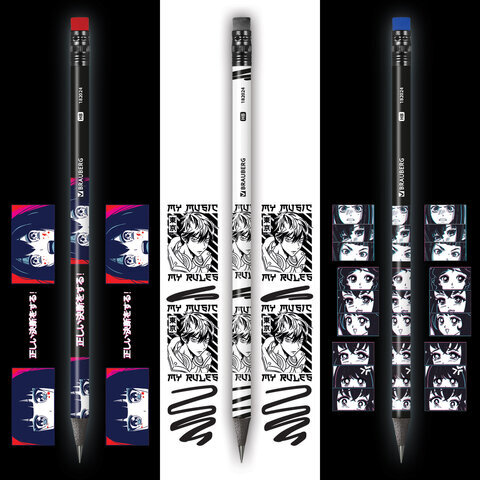 Карандаш чернографитный с принтом BRAUBERG "MANGA", 1 шт., HB, с ластиком, корпус ассорти, 182024