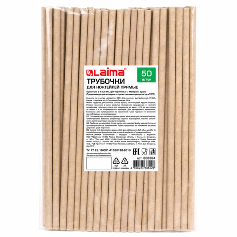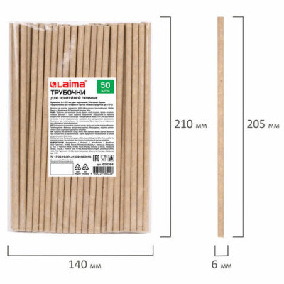 Трубочки для коктейлей бумажные, прямые, 6х205 мм, крафт, комплект 50 штук, LAIMA, 608364