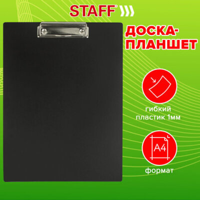 Доска-планшет STAFF с прижимом А4 (315х235 мм), пластик, 1 мм, черная, 229223