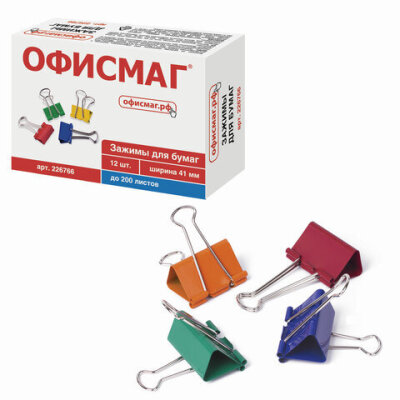Зажимы для бумаг ОФИСМАГ, КОМПЛЕКТ 12 шт., 41 мм, на 200 листов, цветные, картонная коробка, 226766