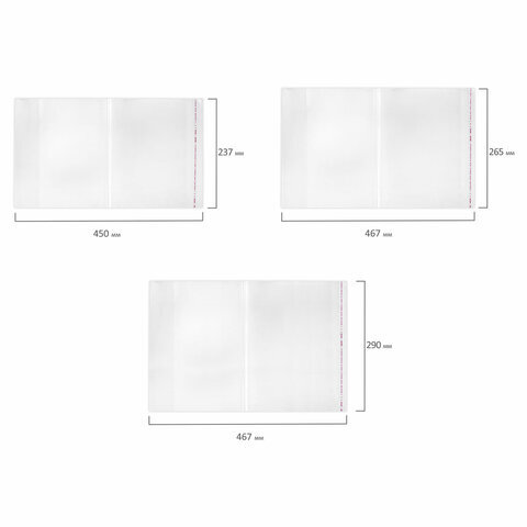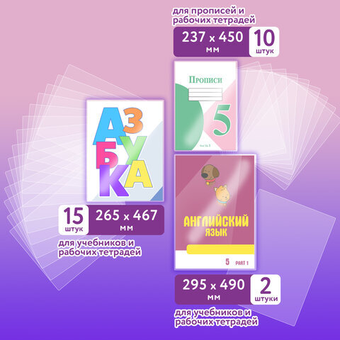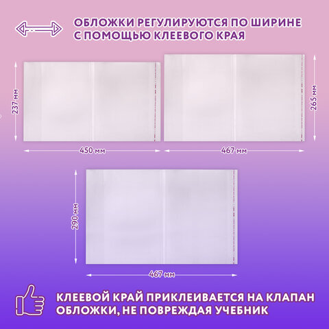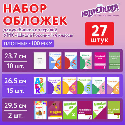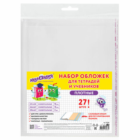 Обложки ПЭ для тетрадей и учебников, НАБОР 27 шт., ПЛОТНЫЕ, 100 мкм, универсальные, прозрачные, ЮНЛАНДИЯ, 272706