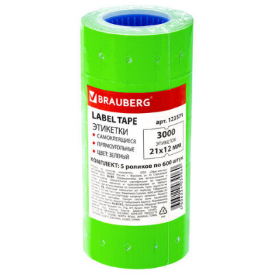 Этикет-лента 21х12 мм, прямоугольная, зеленая, комплект 5 рулонов по 600 шт., BRAUBERG, 123571