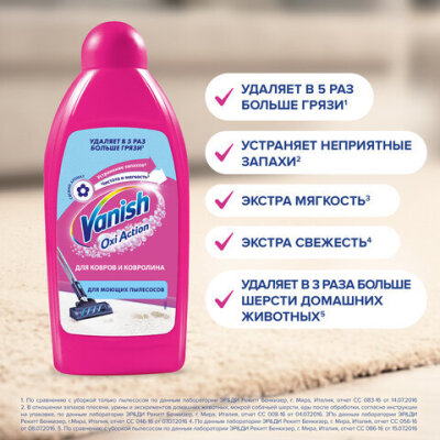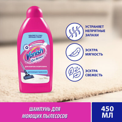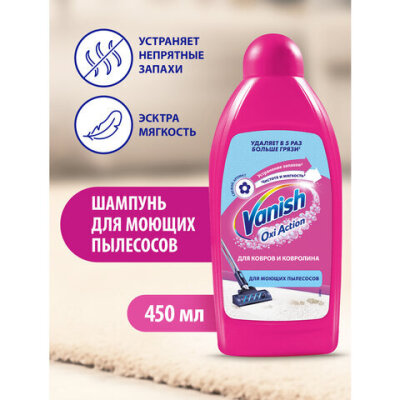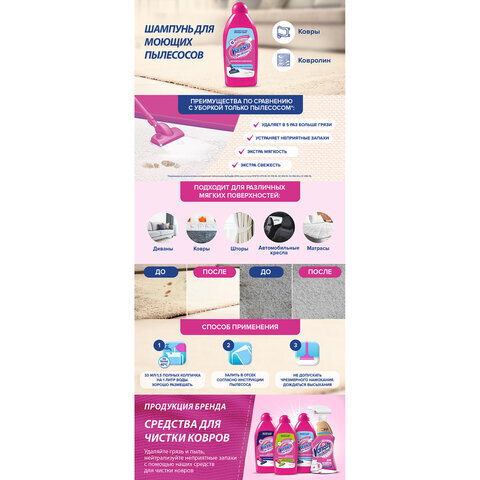 Средств для ковров VANISH "Gold" используется для удаления въевшейся грязи и пыли с ковров, ковролина и обивки. Предназначен для моющих пылесосов. Густой шампунь образует обильную пену и устраняет неприятные запахи.