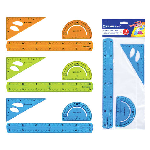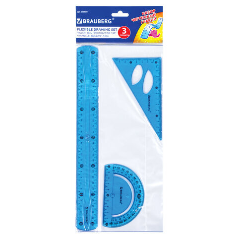Набор чертежный большой гибкий BRAUBERG "FLEX" (линейка 30 см, треугольник, транспортир), ассорти, 210680
