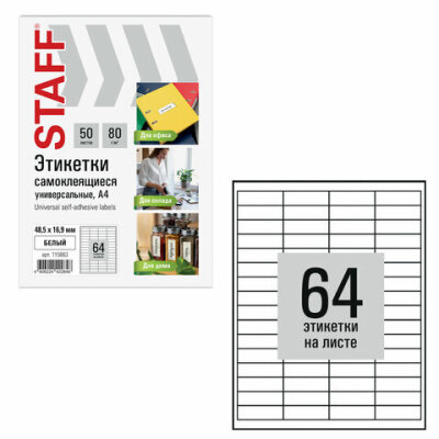 Этикетка самоклеящаяся 48,5х16,9 мм, 64 этикетки, белая, 80 г/м2, 50 листов, STAFF BASIC, 115663