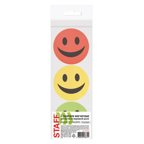 Стиратели магнитные для магнитно-маркерной доски, диаметр 90 мм, "Смайлик", КОМПЛЕКТ 3 ШТ., STAFF "Basic", ассорти, 237502