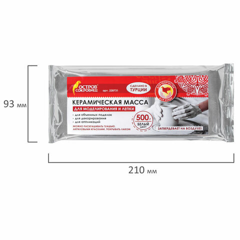 Керамическая масса ОСТРОВ СОКРОВИЩ предназначена для моделирования, лепки, декорирования и создания объемных аппликаций. Самостоятельно затвердевает на воздухе, не требуя термической обработки.
