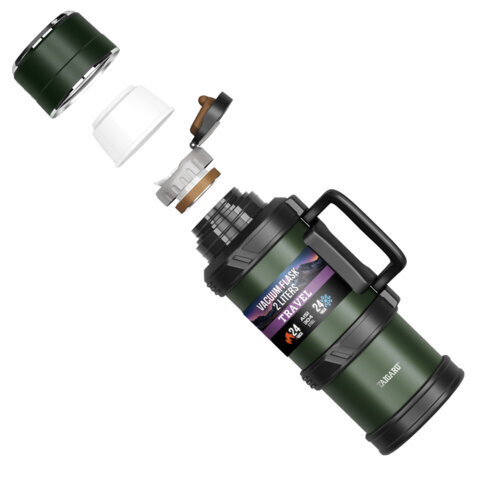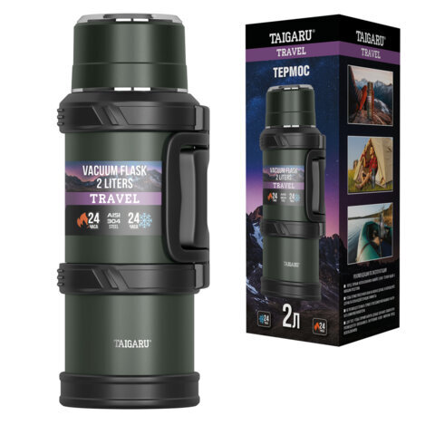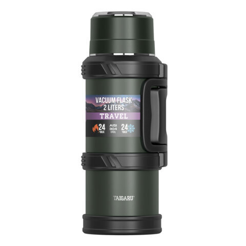Термос 2 л TAIGARU (ТАЙГАРУ) TRAVEL, нержавеющая сталь SUS304, 2 кружки, скрытая ручка, ситечко, темно-зеленый, 700316