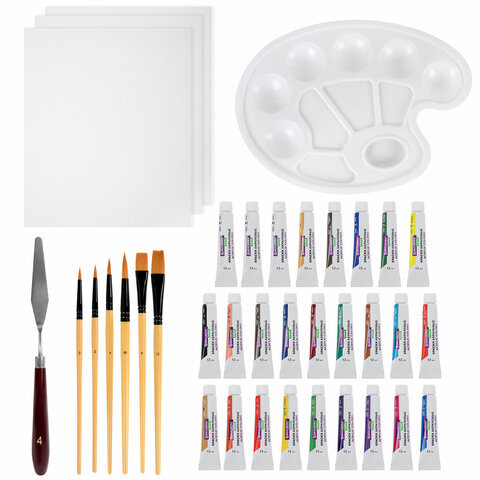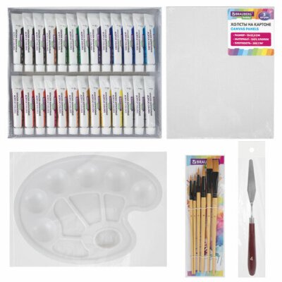 | Комплектация | кисть №0 синтетика круглая, кисть №10 синтетика круглая, кисть №12 синтетика плоская, кисть №2 синтетика круглая, кисть №4 синтетика круглая, кисть №8 синтетика плоская, мастихин, пластиковая палитра, холст 19х22,5 см |