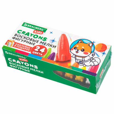 Восковые мелки фигурные BRAUBERG KIDS "РАКЕТА", НАБОР 24 цвета + НАКЛЕЙКИ В ПОДАРОК, 273083