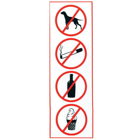 Знак "Запрещение: курить, пить, есть, прохода с животными", 300х100 мм, пленка самоклеящаяся, 610033/НП-В-Б
