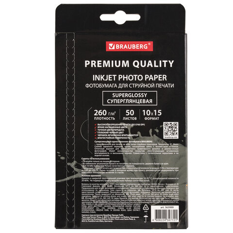 Фотобумага PREMIUM суперглянцевая, 10х15 см, 260 г/м2, односторонняя, 50 листов, BRAUBERG, 363999