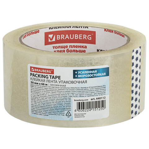 Клейкая лента упаковочная 50 мм х 66 м, прозрачная, УСИЛЕННАЯ, МОРОЗОСТОЙКАЯ, толщина 50 микрон, BRAUBERG, 440112