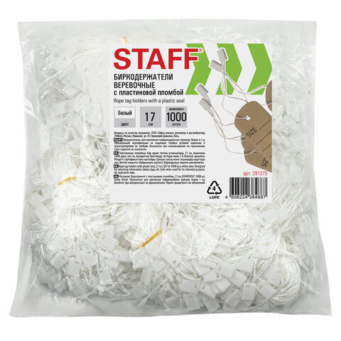 Биркодержатели веревочные с пластиковой пломбой 17 см, STAFF, КОМПЛЕКТ 1000 штук, белые, 291275