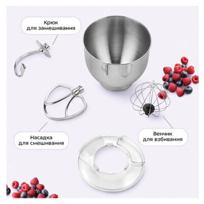 | Комплектация | венчики, крюки для теста, насадка для смешивания, съемная чаша |